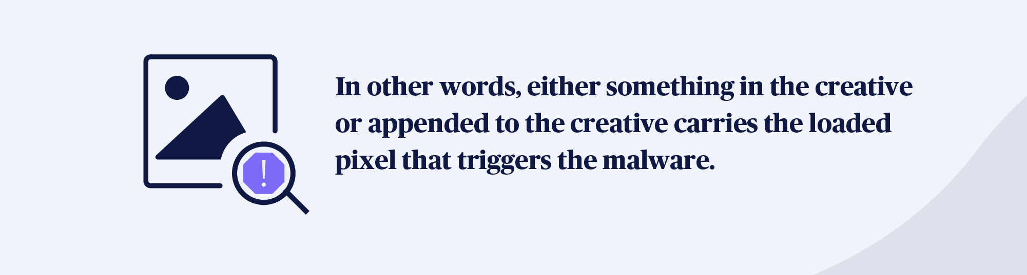 Steganography is a big word with a potentially sinister underlying meaning for publishers – sometimes, a pixel isn’t just a pixel. What might look like a typical picture file at first is actually a loaded weapon, where fraudsters inject JavaScript code into the image. In other words, either something in the creative or appended to the creative carries the loaded pixel that triggers the malware.